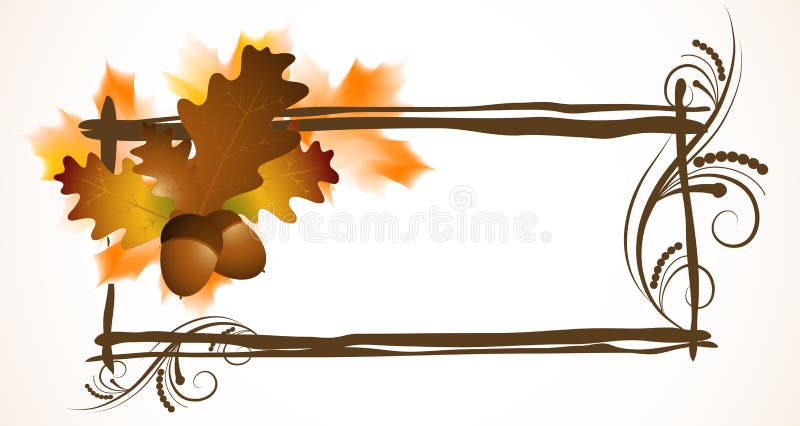 Πλαίσιο με τα φύλλα. Ξύλινο πλαίσιο με τα πορτοκαλιά φύλλα και τα βελανίδια φθινοπώρου